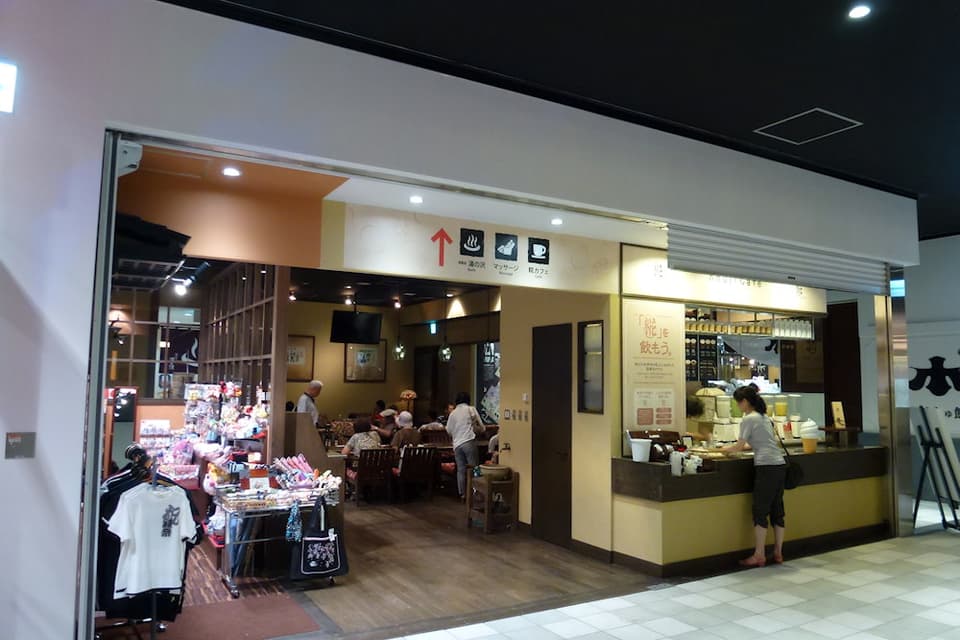 ぽんしゅ館の横の通路を進むと右に「糀カフェ」があり、その店内奥に酒風呂湯の沢の受付があります。
