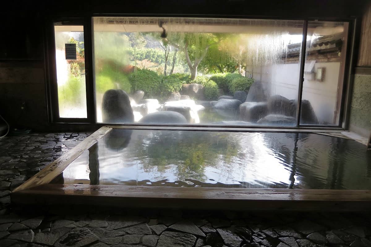 お湯は循環で、加水・加温・塩素消毒されていますが、露天の方には源泉も投入されているようで、灰色の湯花が多数舞っています。