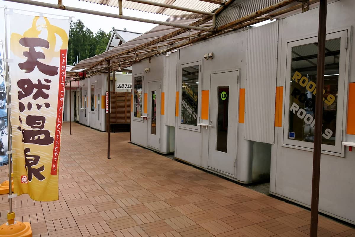 施設内はカラオケボックスがたくさん並んでますが、温泉入口の看板の方へ進んでいきます。