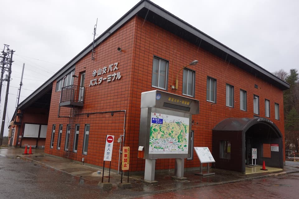 道路沿いの玉こんにゃくの木製の看板が強風で吹き飛んでるのを見て、下山を決意して山交のバスターミナルへ。