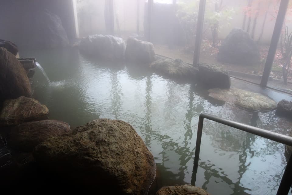 白濁したお湯が大変素晴らしいですが、この日は大雨でめんどくさかったです。