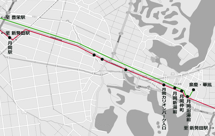 緑線が豊栄駅からの月岡温泉シャトルバスです。