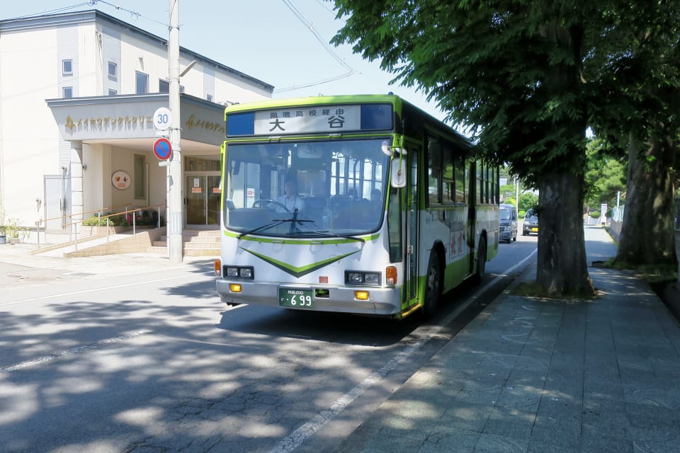 東の湯近くの鳳鳴高校前バス停から秋北バスに乗ります。