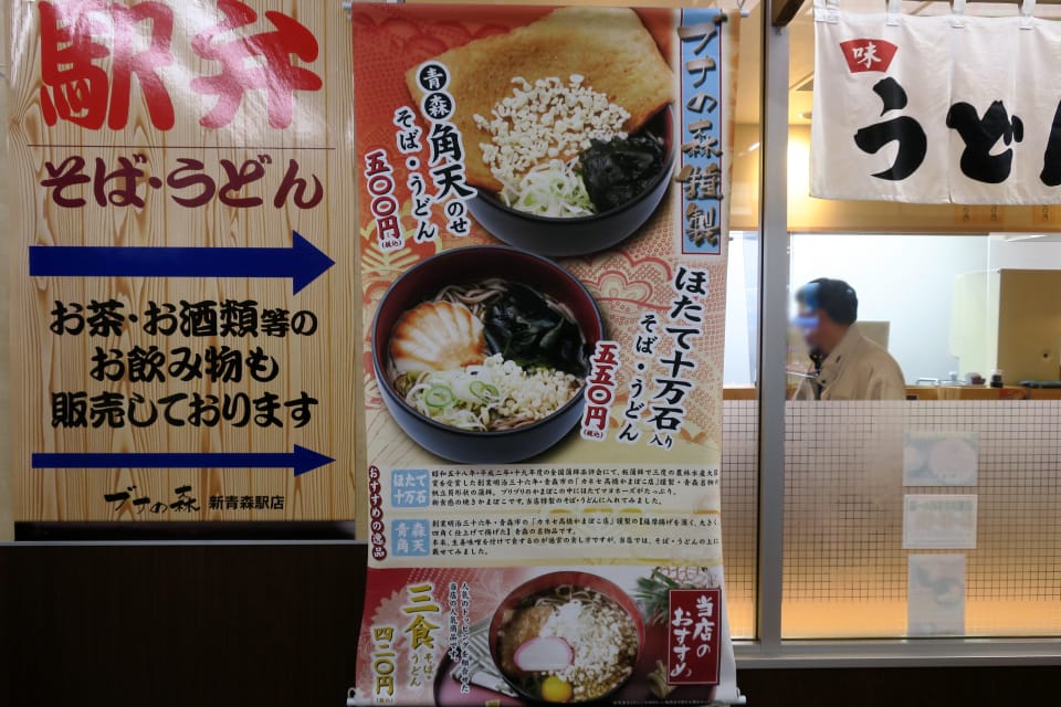 朝飯は健康ランドで食べようかと思ってたのですが、まだ食堂が営業前だったので、一旦新青森駅に戻って立ち食いそば屋に向かいます。
