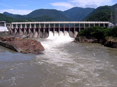 トンネルの先は阿賀野川沿いの歩道で、しばらく進むとゴゴゴゴという音と共にダムが現れます。